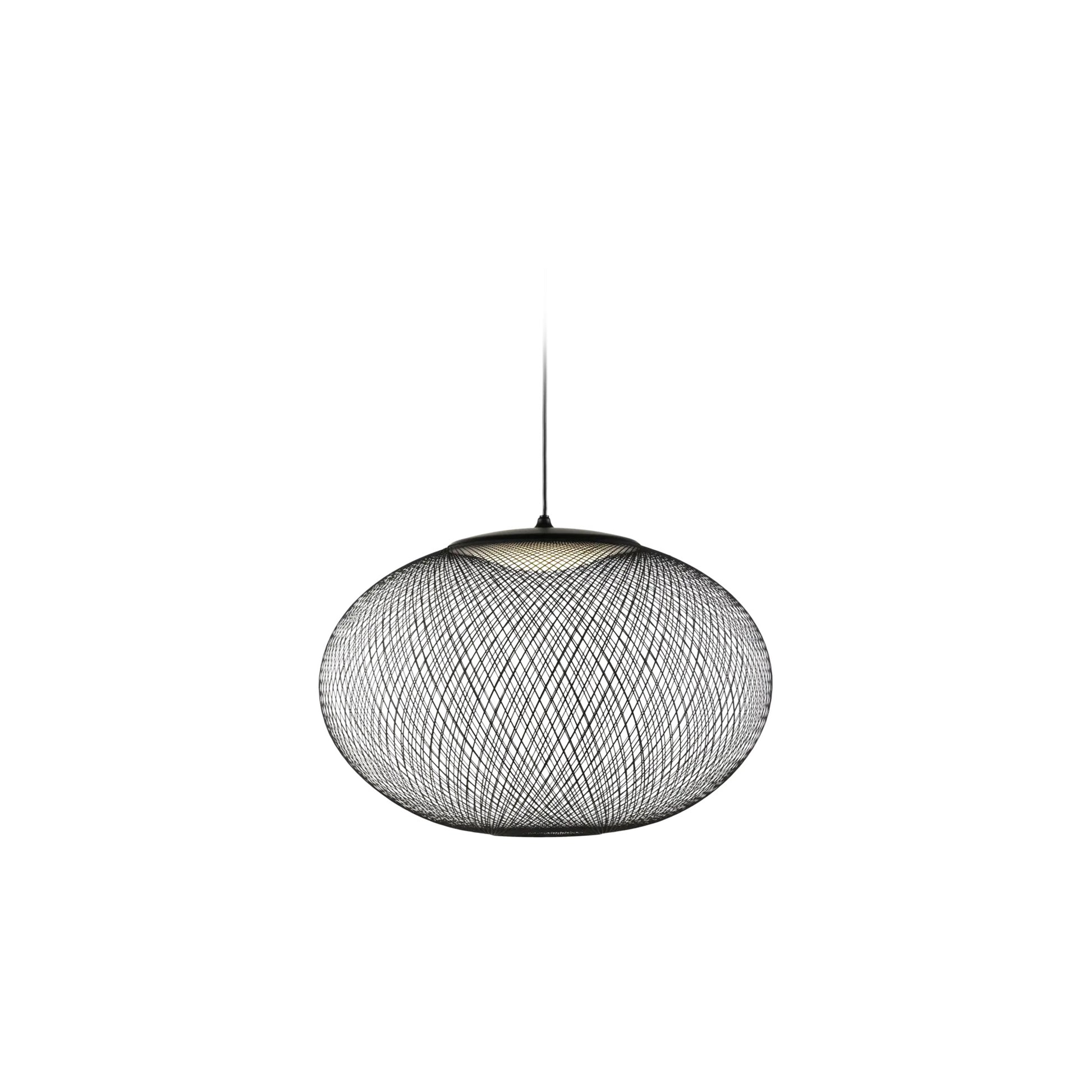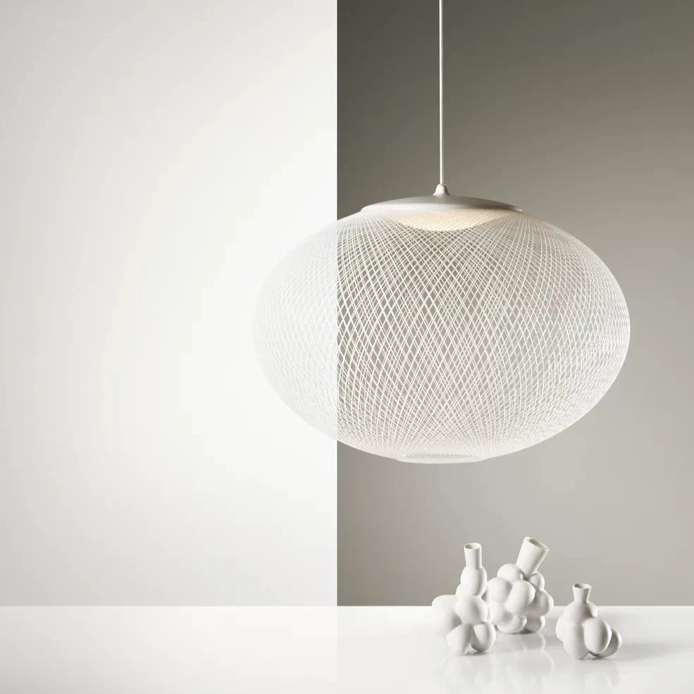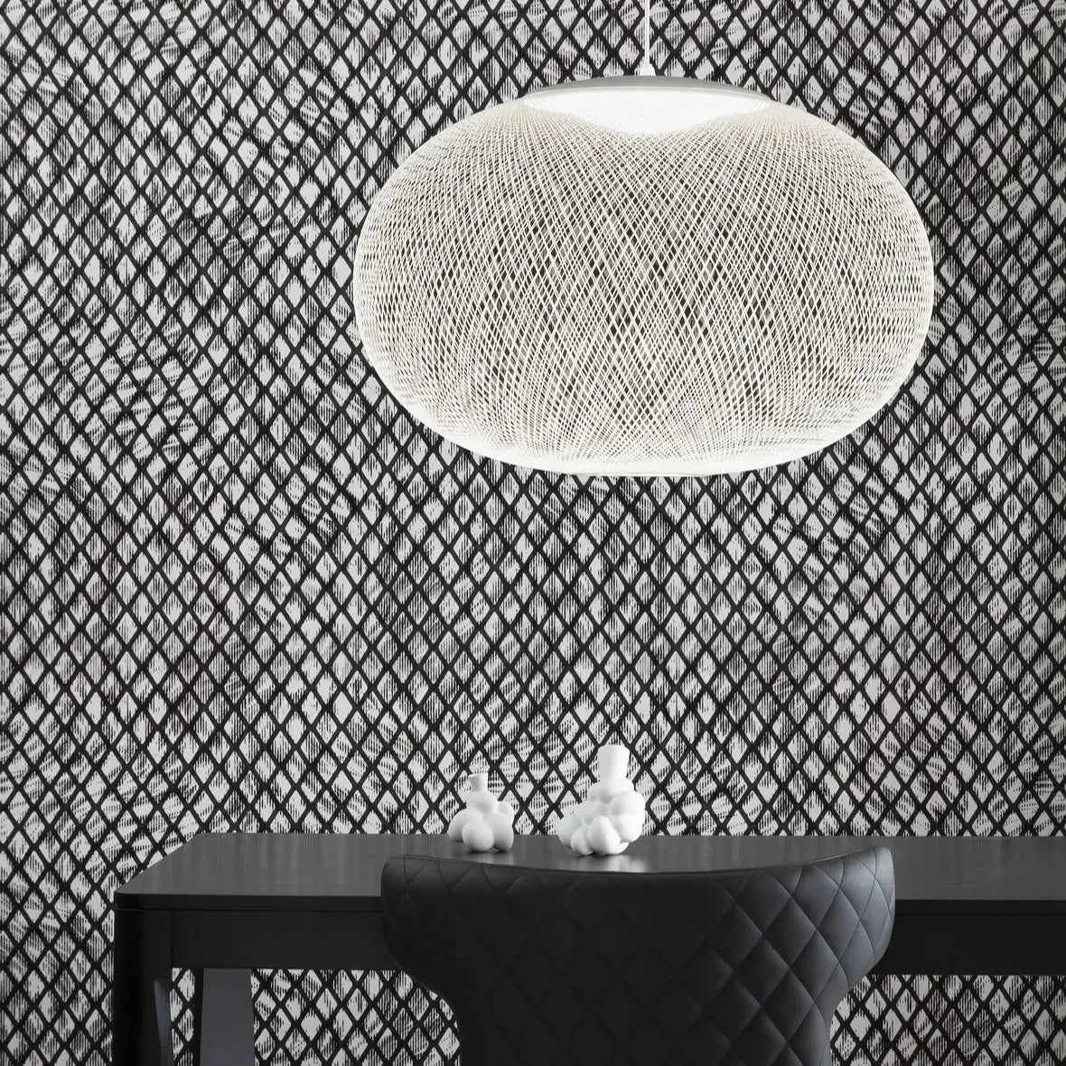 NR2 by Bertjan Pot is an elegant and bright bubble of white or black thread. The lattice pattern creates a fine web that shines and glimmers in the light. The fine web is oval-shaped and bears the signature style of Bertjan Pot; designs created from an experiment with different materials. The integrated LED lamp in NR2 subtly diffuses a soft and magical glow around the room. NR2 is available in two different colours and sizes.