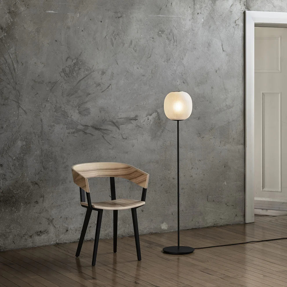 The Bloom Floor Lights’ super-elliptical form is inspired by the gentle dynamic flow of paper lanterns. Its glorious lit effect is the result of transparency and light. Two contrasting materials – a finely perforated mesh core and frosted blown glass, combine to project a soft focus texture onto the inside of the shade.