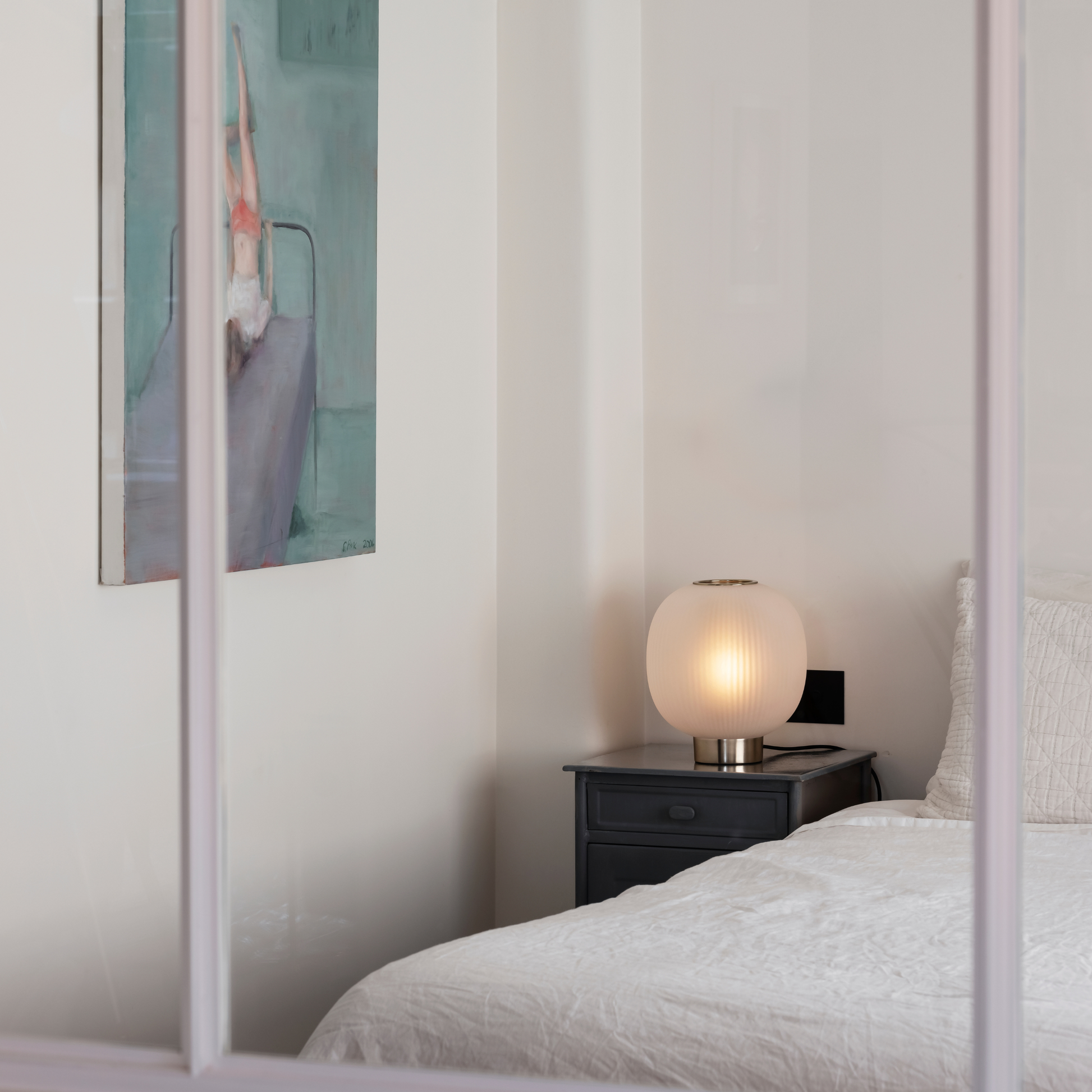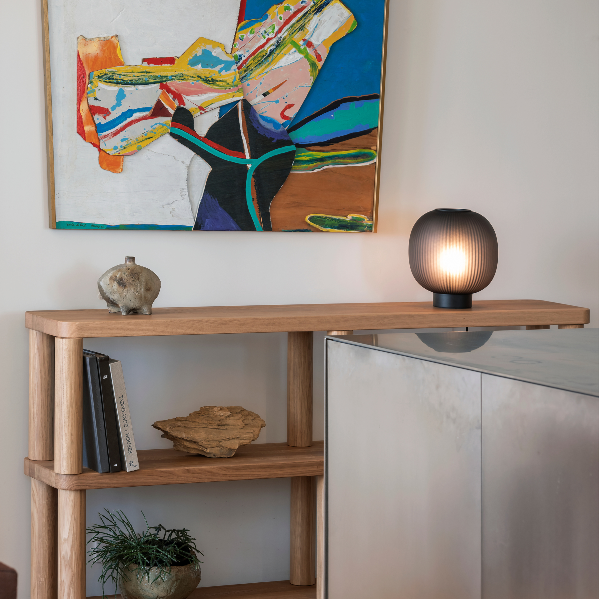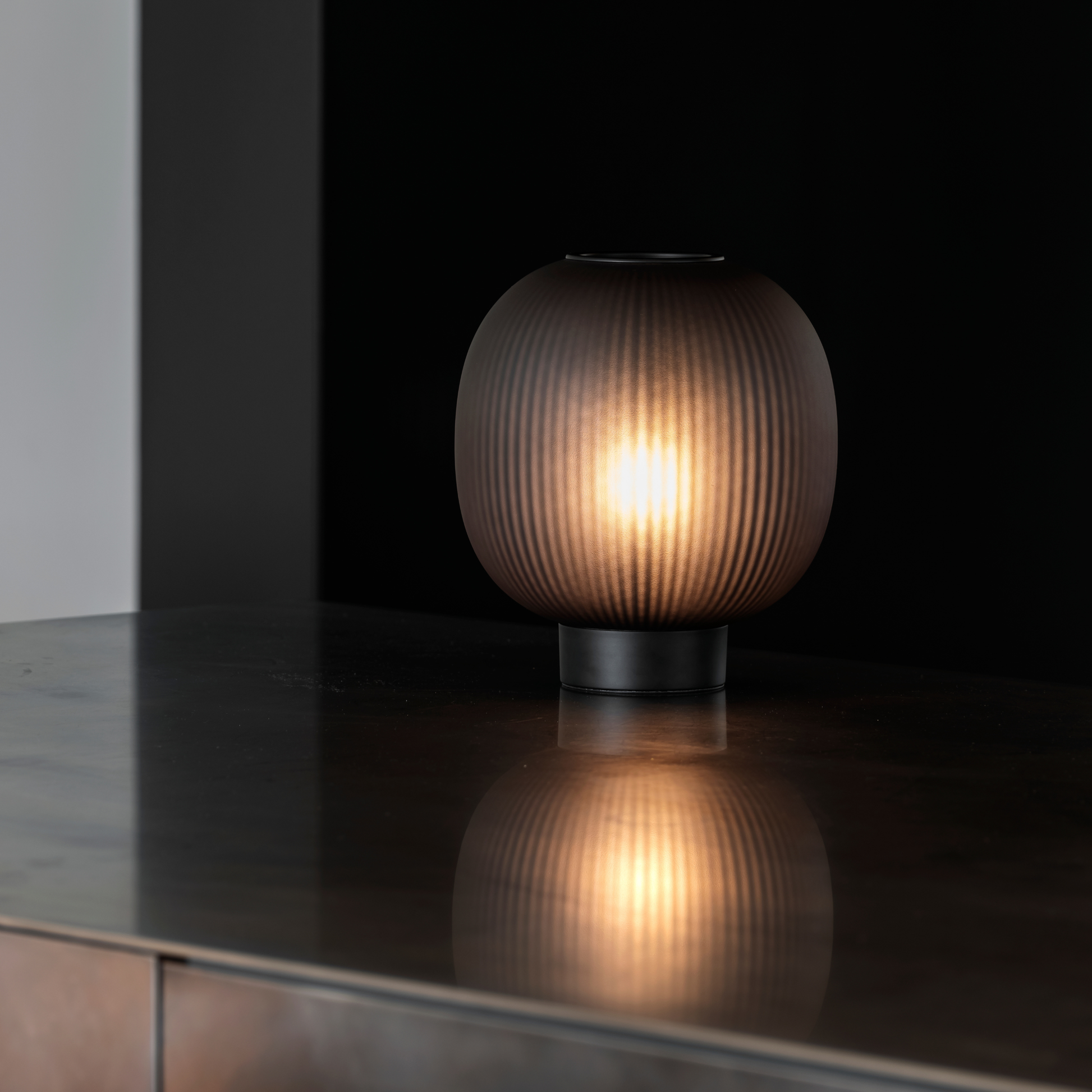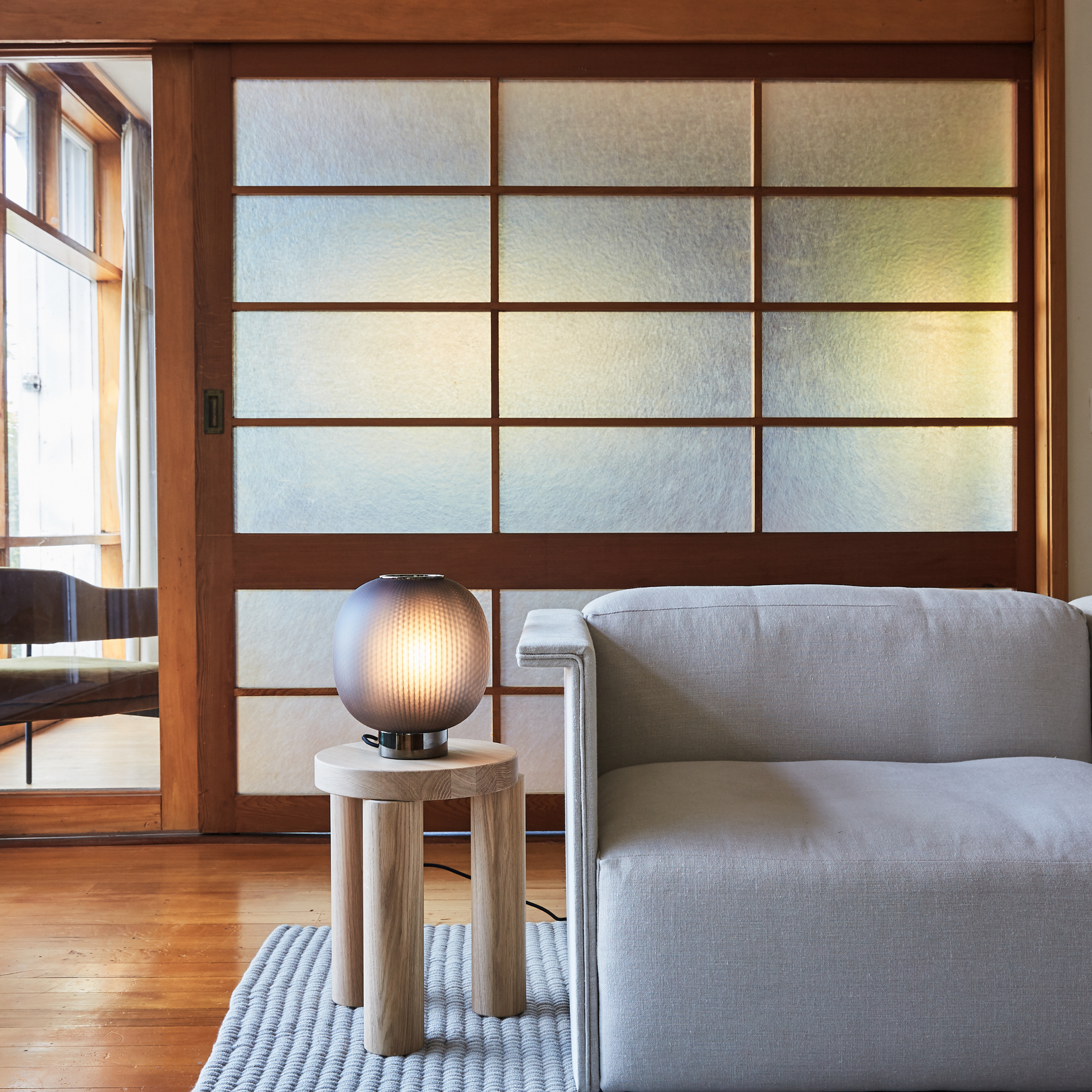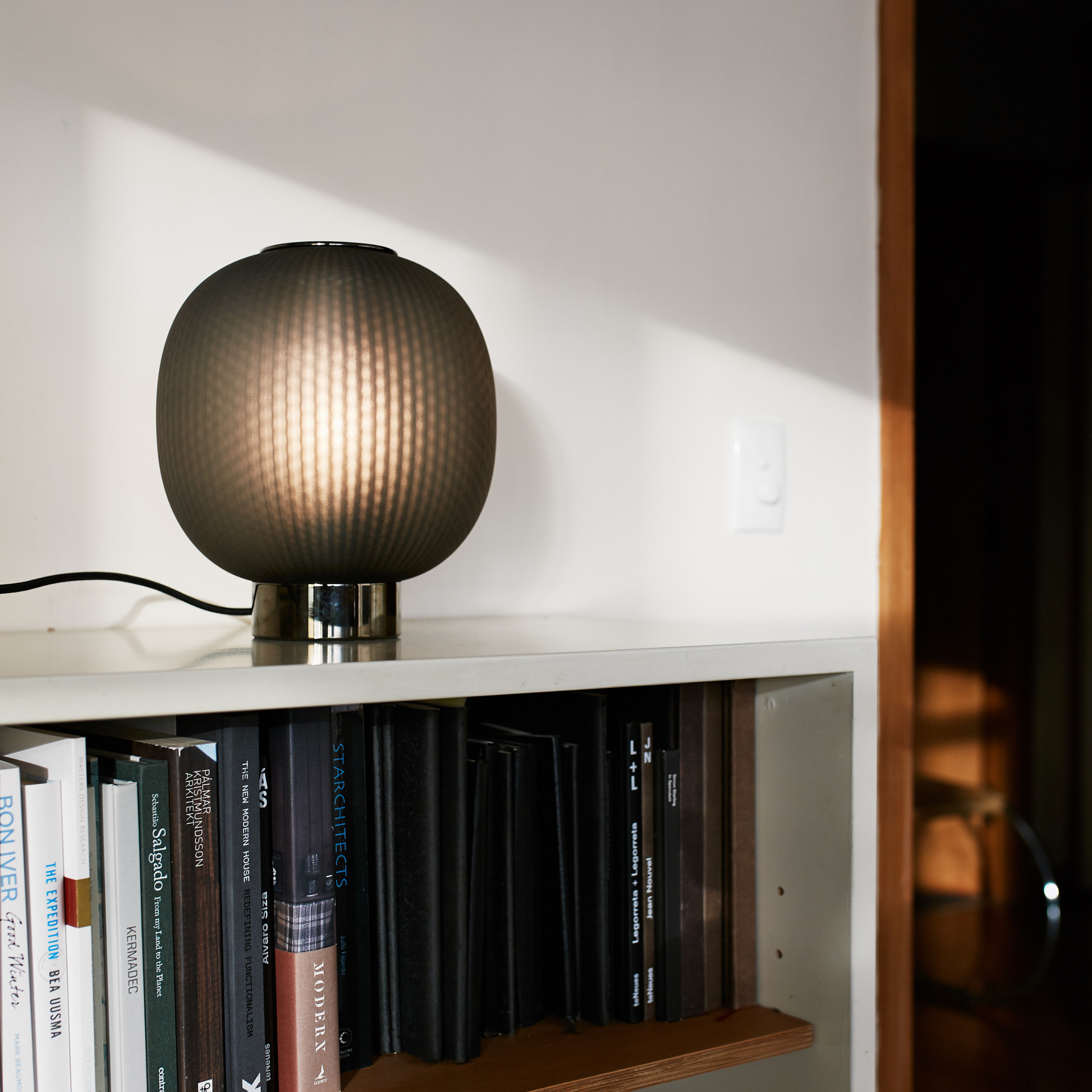 The Bloom Table Light’s super-elliptical form is inspired by the gentle dynamic flow of paper lanterns. Its glorious lit effect is the result of transparency and light. Two contrasting materials – a finely perforated mesh core and frosted blown glass, combine to project a soft focus texture onto the inside of the shade.