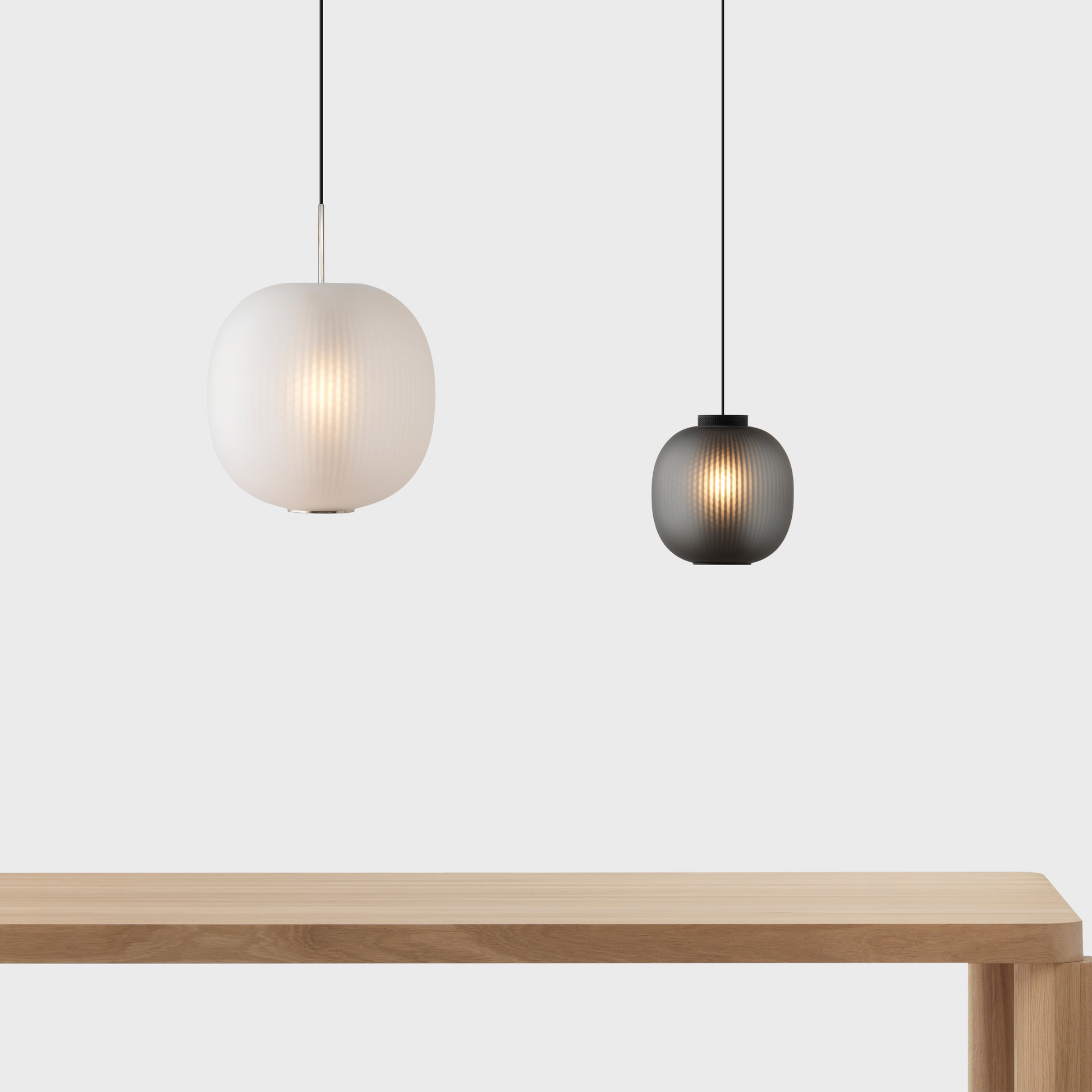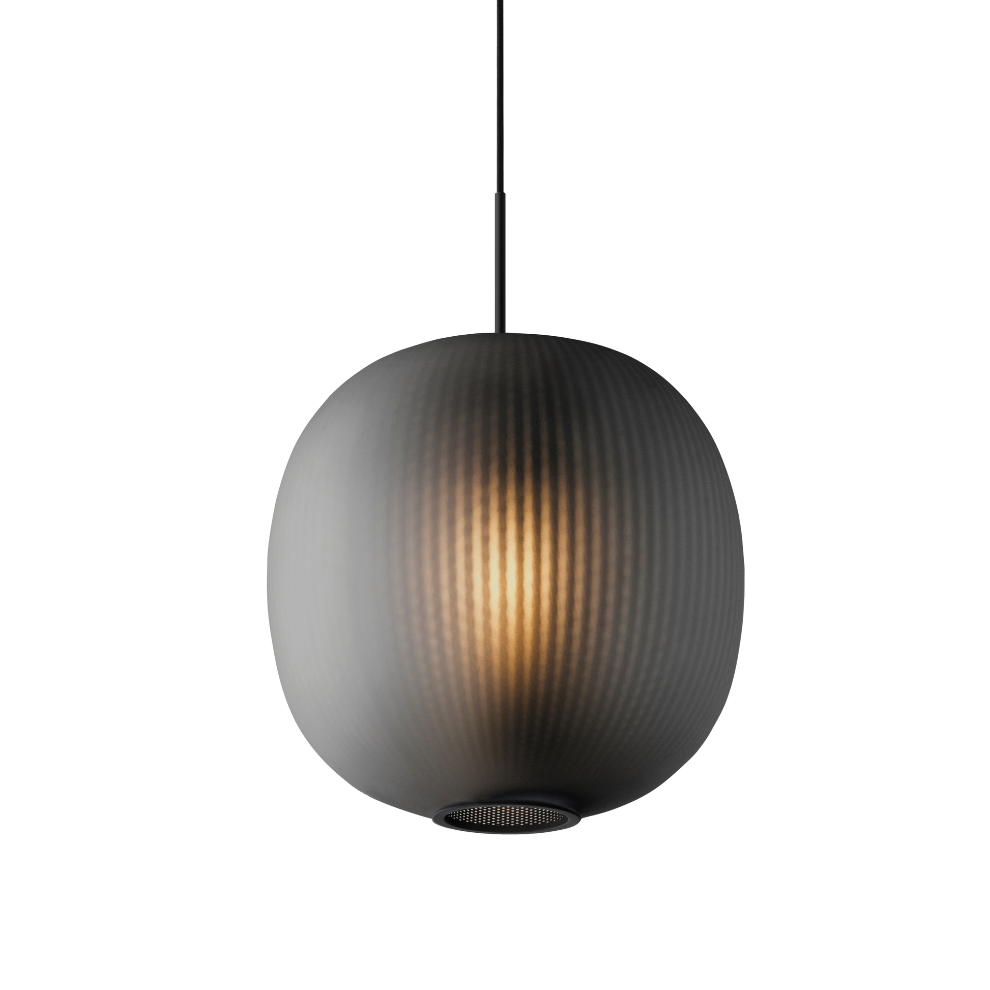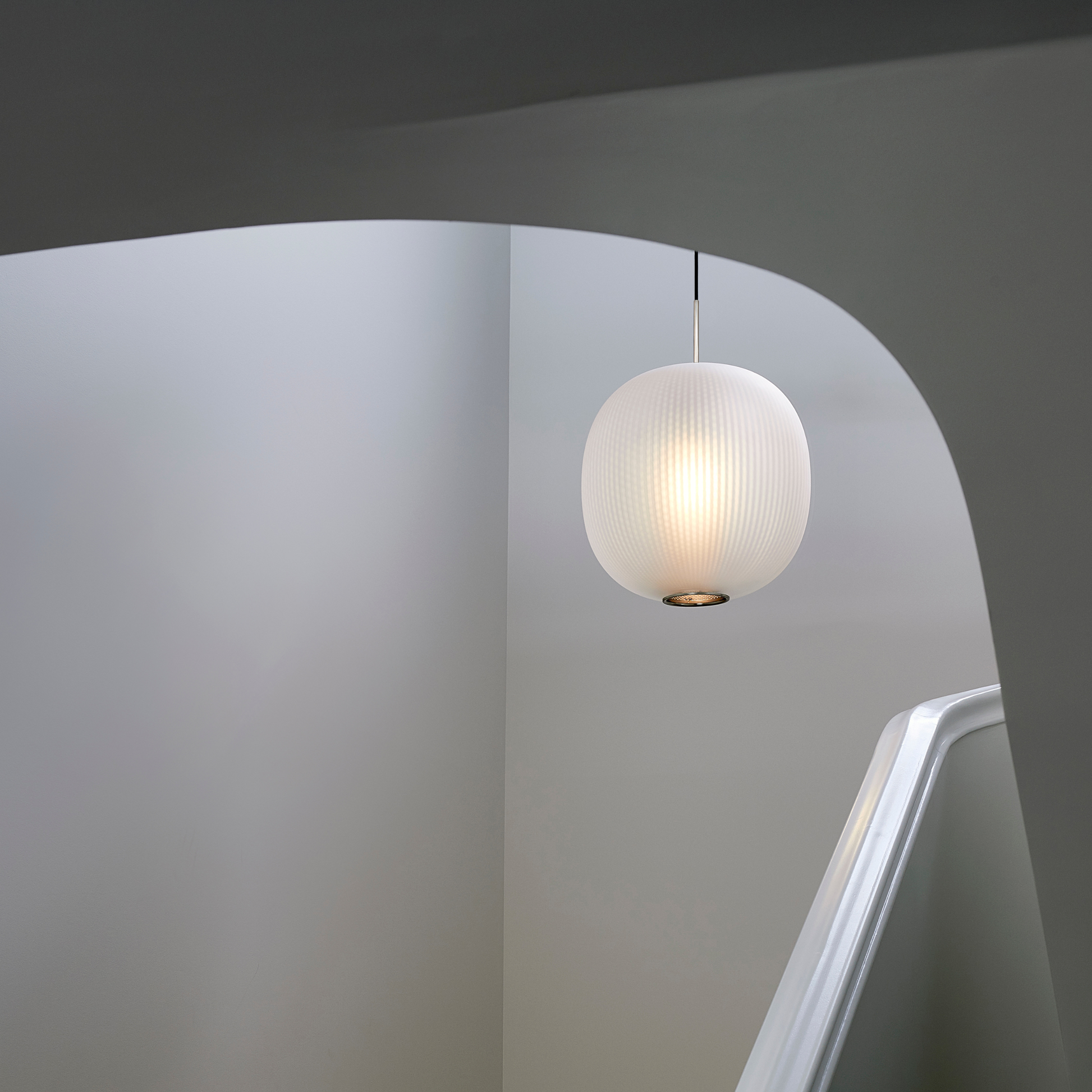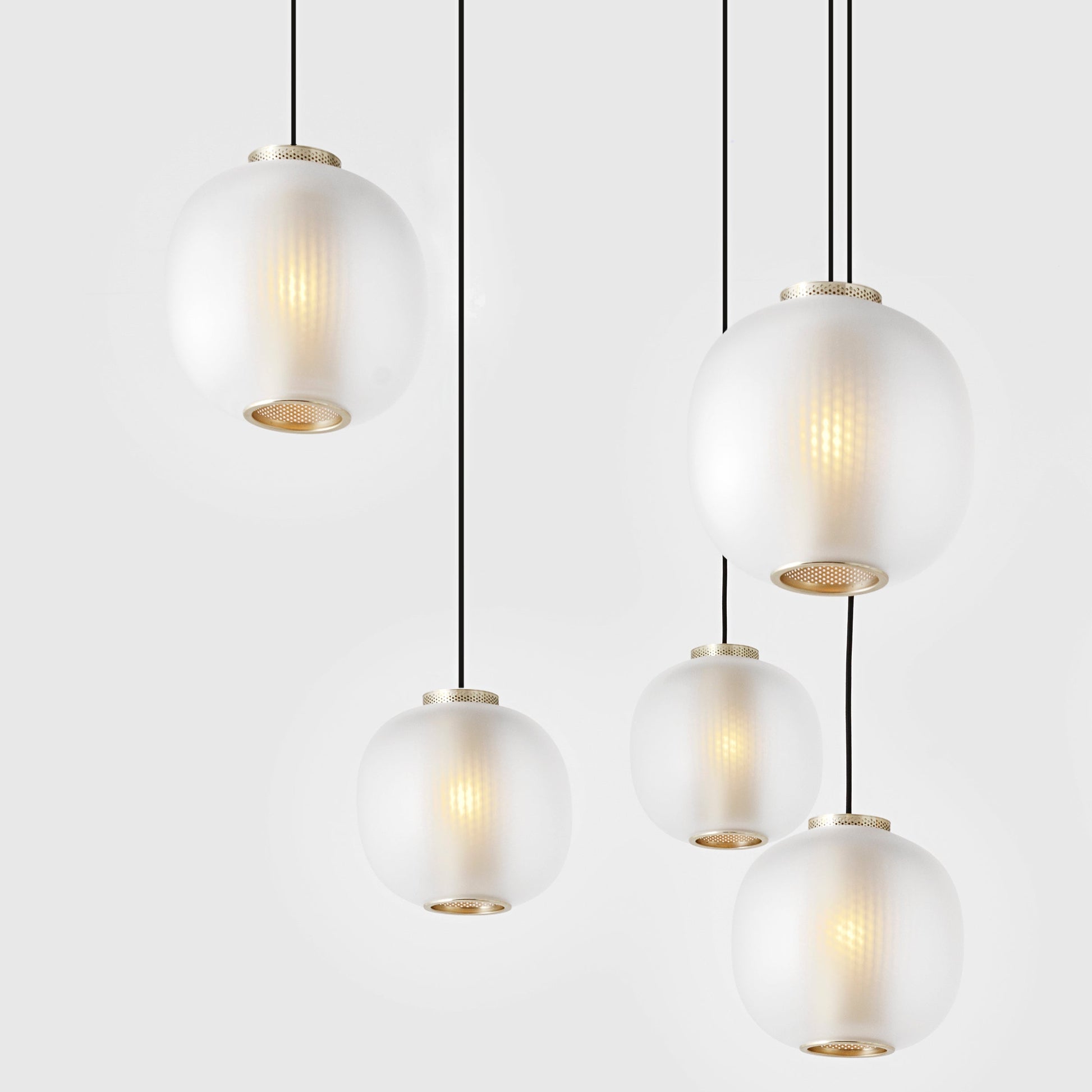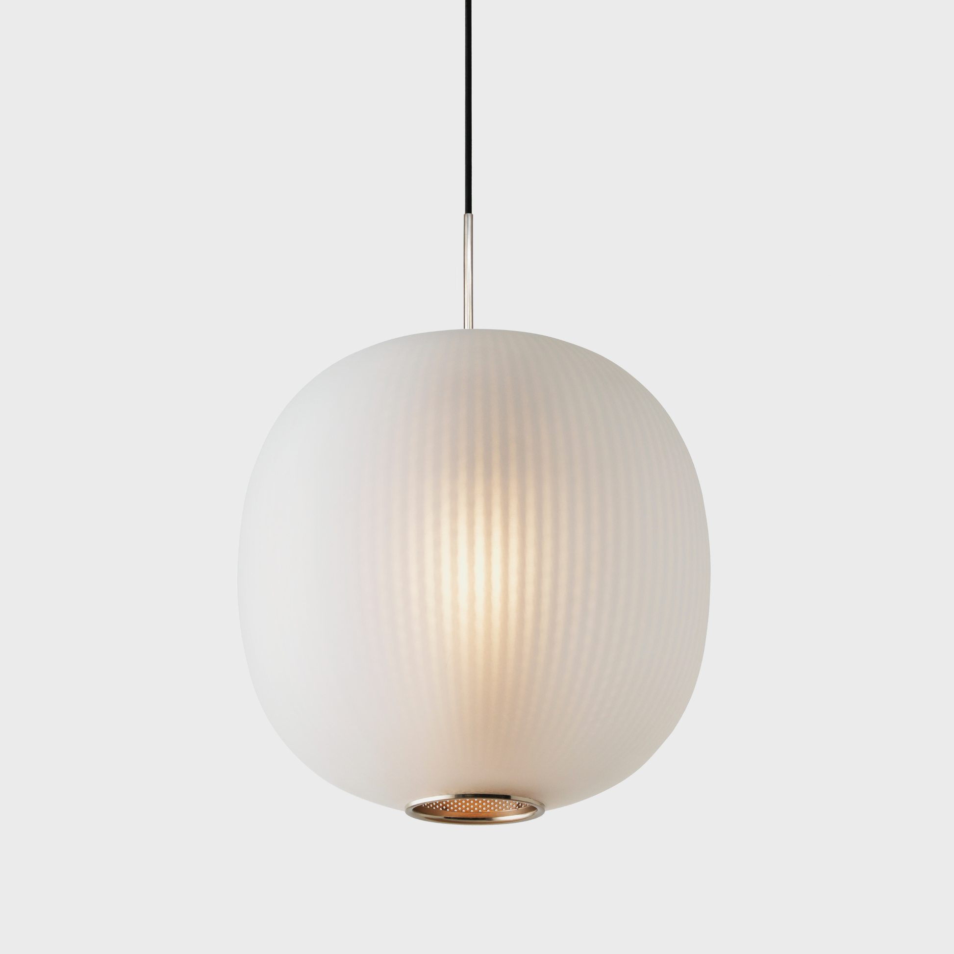 The Bloom Pendant’s super-elliptical form is inspired by the gentle dynamic flow of paper lanterns. Transparency and light create a glorious lit effect through the use of two contrasting materials – a finely perforated mesh core and frosted blown glass – which combine to project a soft-focus texture onto the inside of the shade.