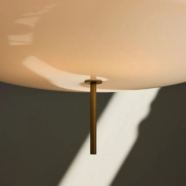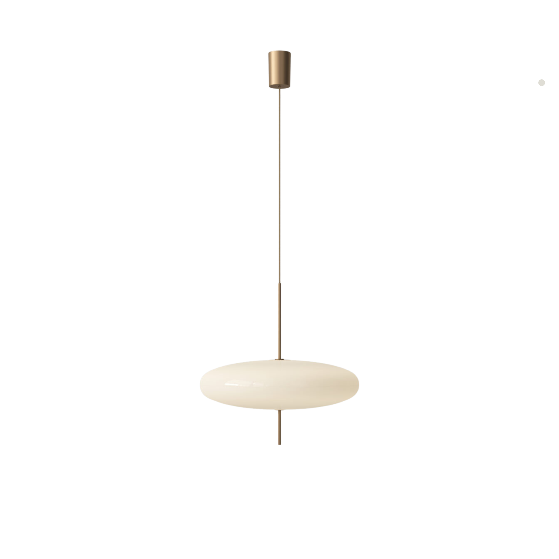 The Model 2065 is made of two joined opaline methacrylate saucer-shaped diffusers, suspended from a black painted aluminium ceiling canopy. The simplicity of the design and lightness of the materials makes for an elegant and free-floating luminaire. The newest version adds to these features in terms of sustainability: the diffusers are made of Green Cast®, a 100% recycled and recyclable PMMA (polymethyl methacrylate) — patented and made in Italy — that has exactly the same aesthetic and functional quality of original methacrylate.